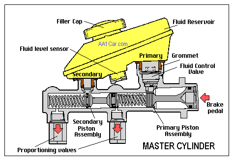 The master cylinder is the heart of the brake's hydraulic system. It converts the force exerted on the brake pedal into hydraulic pressure to apply the brakes. Depressing the brake pedal moves a push rod in the master cylinder. Mounted on the push rod are a pair of pistons (primary and secondary) in tandem (one after the other) that exert force against the fluid in the master cylinder bore. The pressure created displaces fluid through the various brake circuits and lines to each of the wheels and applies the brakes.